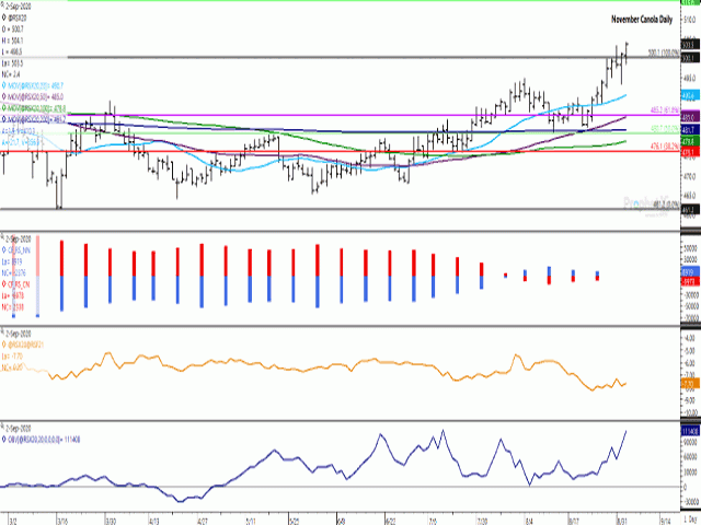 November canola reached a high of $499.80/metric ton on Aug. 27 and a high of $499.90/mt on Aug. 28. On Aug 31, a high of $503.20/mt was reached, although price slumped to close at $498.20/mt. After trading both sides of $500/mt on Sept. 1 and as low as $493.40/mt, price finally closed at $501.10/mt, near the upper-end of the session's trading range to reach a fresh 2020 high. Sept. 2 trade saw prices push even higher, ending up $2.40/mt at $503.50/mt, after once again trading as low as $498.50/mt. While the $500/mt mark briefly acted as resistance, recent trade shows this level now acting as support.