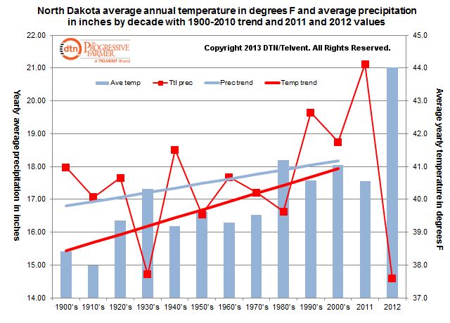 The graphic does show that North Dakota average temperatures and precipitation has increased over the past 100 years as evidenced by a rising trend.
