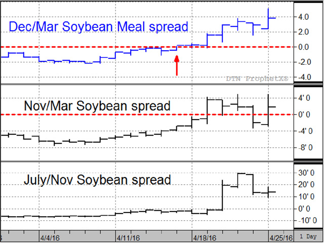 It's still not clear what lit the fire under soybean prices, but a closer look at futures spreads tells us where the fire started. The initial spark came from commercial buying in new-crop soybean meal as the Dec/Mar meal spread closed at a new high on Apr. 12 and finished with the December contract priced above the March contract on Friday, Apr. 15. The new bullish inverse gave us the first market clue that demand for soybean meal was stronger than previously believed and the fact that it happened in meal first was a bullish shock as the U.S. had been losing export business to Argentina earlier in the 2015-16 season.