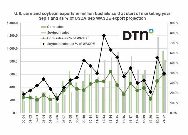 This graphic shows U.S. corn and soybean exports in million bushels sold at start of marketing year September 1 on the left-hand axis and as percent of the USDA's September WASDE export projection on the right-hand axis.